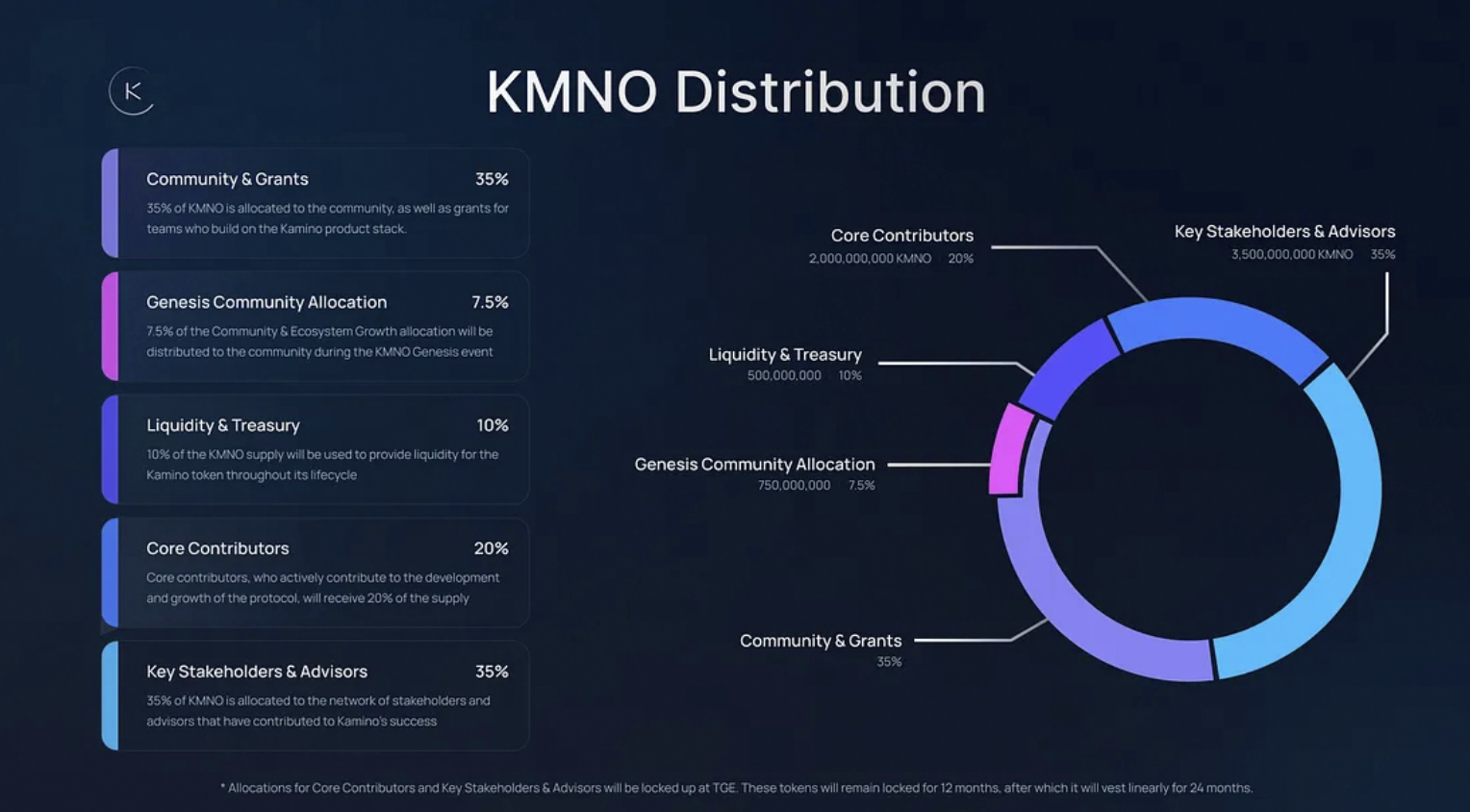- 투명한 토크노믹스: 총 공급량은 100억 KMNO이며, 코어 팀, 투자자, 재단 물량에는 락업과 베스팅 조건이 적용됩니다. 이는 단기적 매도 압력을 줄이고, 프로젝트의 지속성을 담보하기 위한 장치입니다.