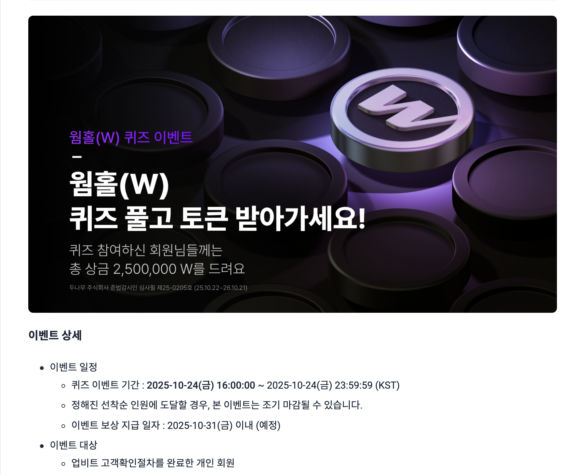 업비트가 2025년 10월 24일 공개한 웜홀(W) 퀴즈 이벤트가 커뮤니티의 큰 주목을 받고 있습니다.
